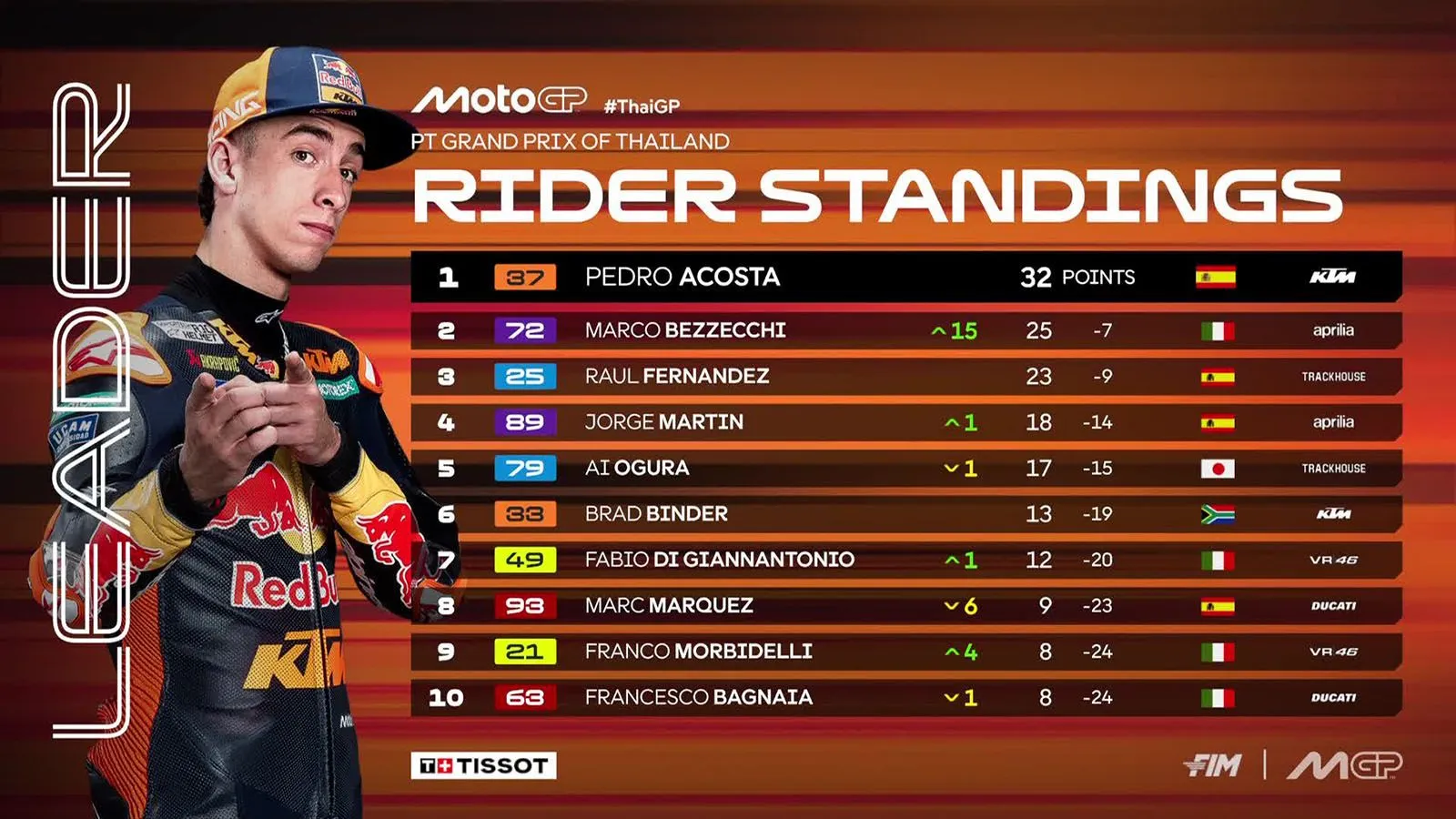Παρά την κυριαρχική νίκη του Μάρκο Μπετζέκι της Aprilia στο Μπουριράμ, ο Πέδρο Ακόστα είναι ο πρώτος αναβάτης στην ιστορία της ΚΤΜ στο MotoGP που ηγείται του πρωταθλήματος.