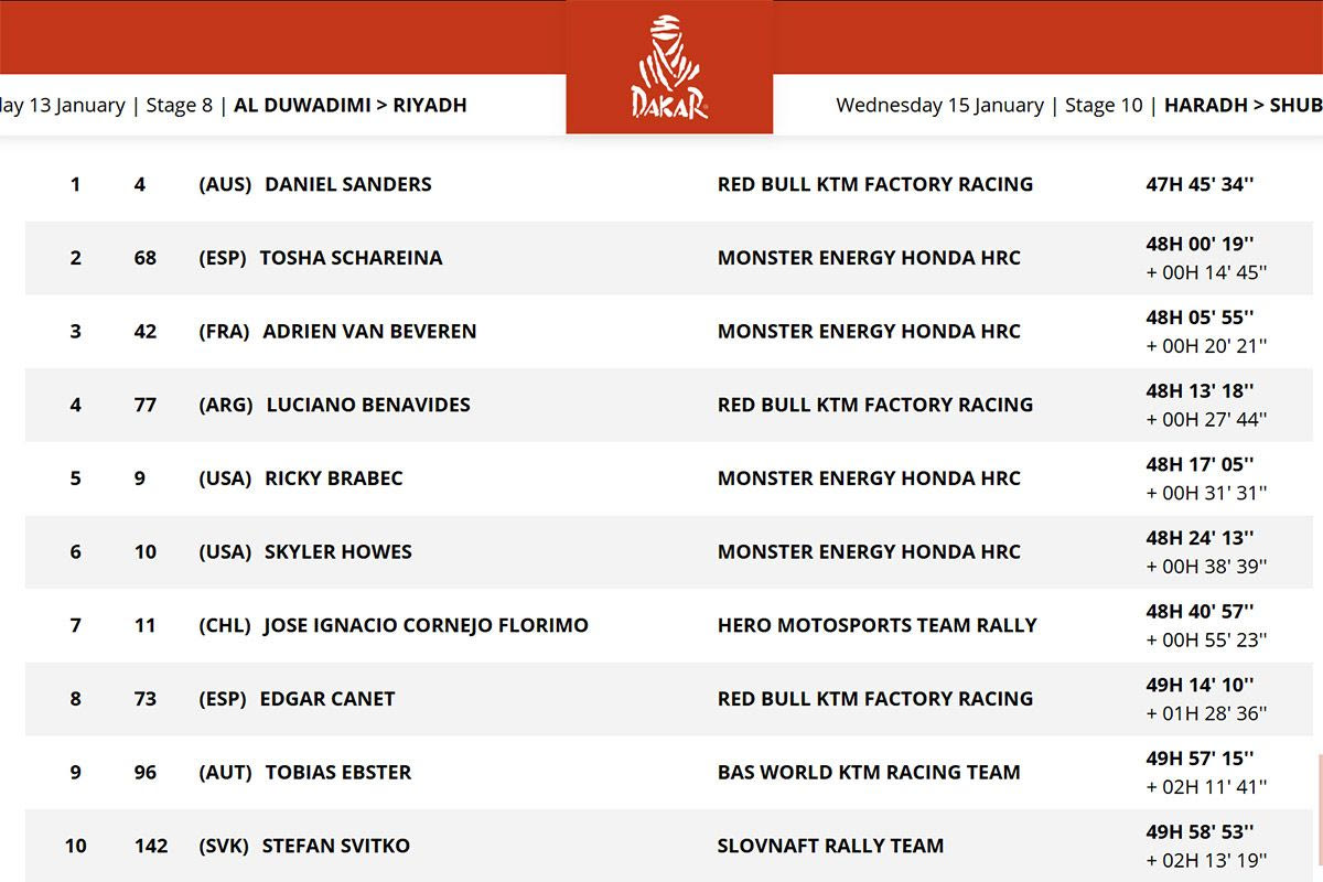 Καθώς, όμως, η ΚΤΜ μέτρησε για πρώτη φορά από το 2018 επτά νίκες σε Ειδικές ενός Ντακάρ, ο Τόσα Σαρέινα της Honda είχε μια άσχημη πτώση που του κόστισε αρκετά, με αποτέλεσμα να χάσει 3’:42’’ από τον πρωτοπόρο της γενικής Ντάνιελ Σάντερς της ΚΤΜ στη μάχη της πρωτοπορίας.