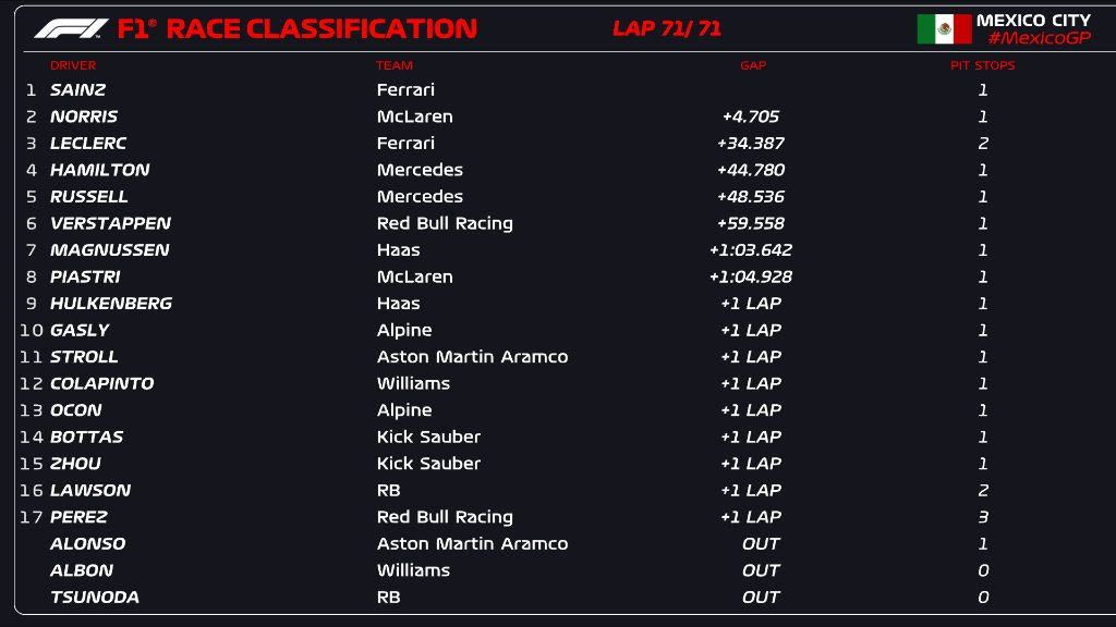 Τέσσερις αγώνες πριν αποχωρήσει από τη Scuderia για χαρη του Λιούις Χάμιλτον, ο Κάρλος Σάινθ έστειλε ένα ηχηρό μήνυμα προς το Μαρανέλο και πάσα άλλη κατεύθυνση κυριαρχόντας στο GP της Πόλης του Μεξικού, εμπρός από τον Λάντο Νόρις που αξιοποίησε ένα λάθος του Μονεγάσκου στο τέλος για να πάρει τη 2η θέση. Δύο ποινές 10+10’’ έριξαν τον Μαξ Φερστάπεν στην 6η θέση.