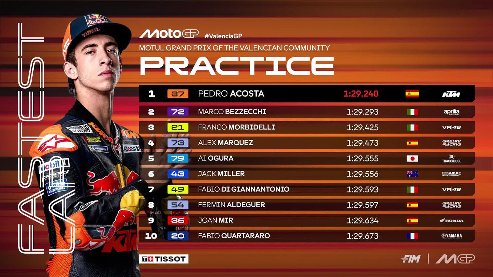 Ο Πέδρο Ακόστα της ΚΤΜ και ο Μάρκο Μπετζέκι της Aprilia χωρίστηκαν από μόλις μισό δέκατο του δευτερολέπτου στην κορυφή των χρονομετρημένων δοκιμών του MotoGP της Βαλένθια, στην Ισπανία, ενώ ο Πέκο Μπανάια και ο Χόρχε Μαρτίν θα πρέπει να παλέψουν στο Q1 των αυριακών δοκιμών κατάταξης.