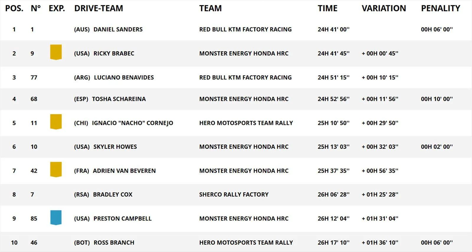 Έτσι, ο Ρίκι Μπράμπεκ της Honda αποκόμισε τα οφέλη της εντυπωσιακής του συνέπειας, τόσο κατά τη σημερινή ημέρα όσο και συνολικά από την εκκίνηση στη Γιανμπού. Ο Αμερικανός κατέκτησε την 12η νίκη Ειδικής της καριέρας του στο Ντακάρ μετά την ποινή στον Σάντερς και επιβεβαίωσε ότι αποτελεί τον βασικότερο αντίπαλο του Αυστραλού – τον οποίο πλησίασε τώρα στα 45 δευτερόλεπτα.