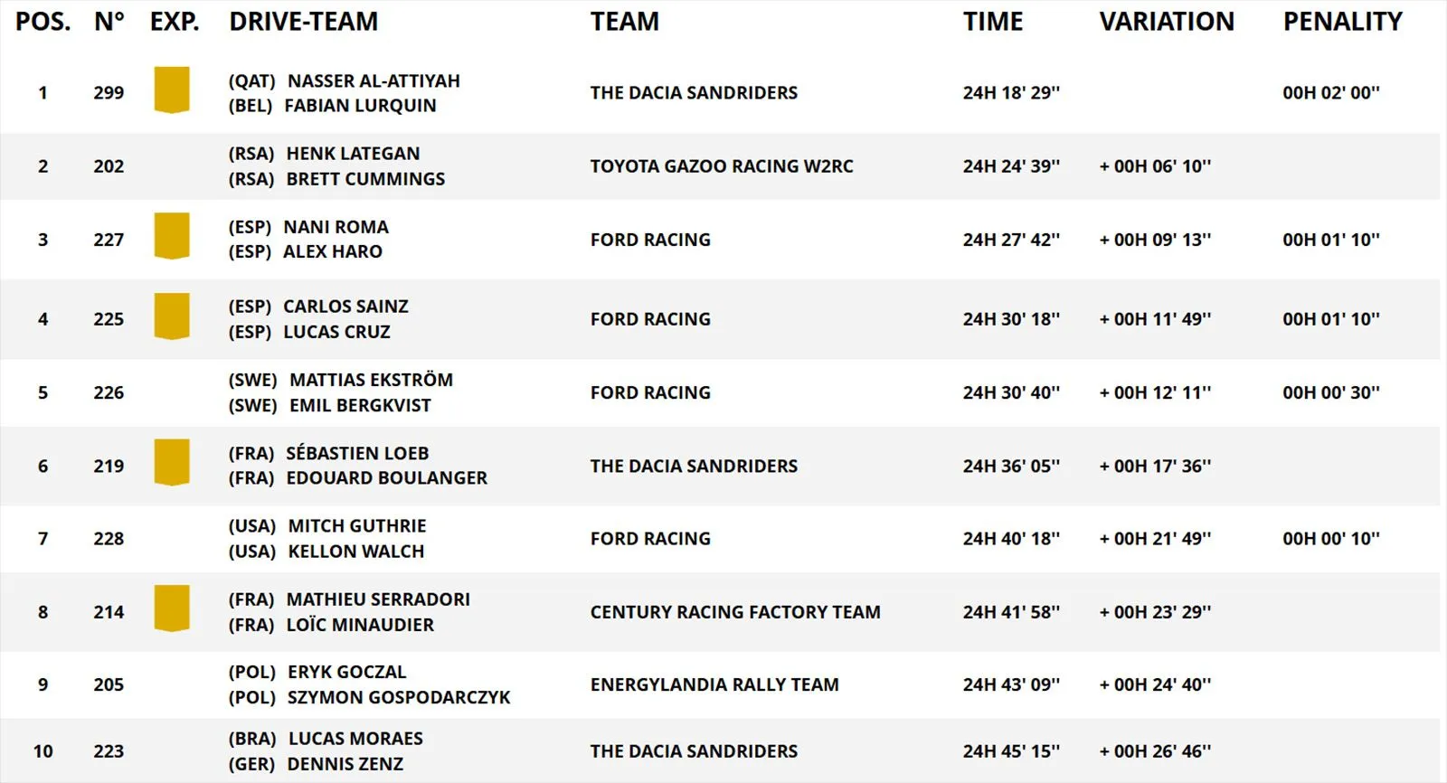 Στην ημέρα ξεκούρασης, λοιπόν, ο Αλ-Ατίγια προηγείται του Λάτεγκαν με διαφορά 6 λεπτών, ενώ διαμορφώνεται ξεκάθαρα τριπλή μάχη στους κατατασκευαστές ανάμεσα στις Dacia, Toyota και Ford. Ο Λεμπ, στο μεταξύ, ανέβηκε στην 6η θέση της γενικής, προσπερνώντας τον Μιτς Γκάθρι της Ford – ο οποίος πλήρωσε το άνοιγμα της διαδρομής μετά τη νίκη του στην ΕΔ5.