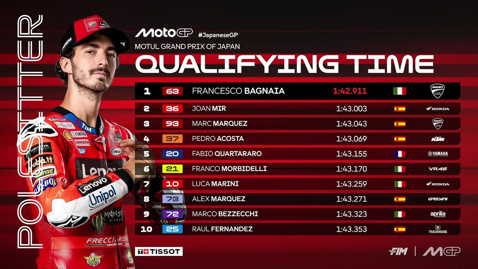 Ο δις πρωταθλητής του MotoGP Φραντσέσκο Μπανάια επιβεβαίωσε την καλή του φόρμα από τις πρώτες δοκιμές κερδίζοντας με την εργοστασιακή Ducati την πολ ποζίσιον του GP Ιαπωνίας, εμπρός από τον Τζοάν Μιρ της Honda και τον Μαρκ Μάρκεζ με την έτερη GP25.