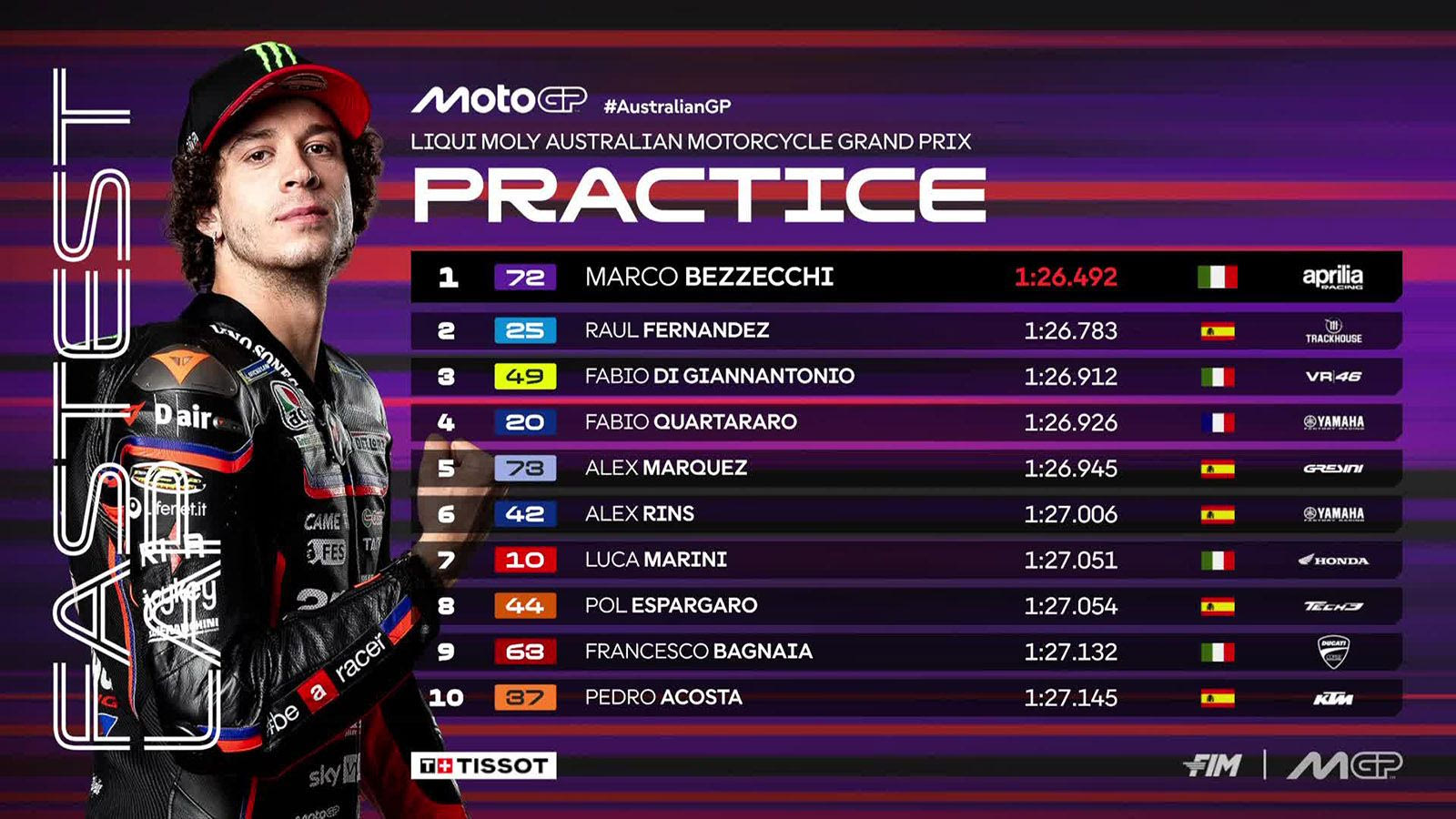 Ο Μπετζέκι επικράτησε στα σημερινά Χρονομετρημένα με διαφορά 0,241 δευτ. από τον Ραούλ Φερνάντεζ της Trackhouse Aprilia, σε μία περίοδο γεμάτη ανατροπές – όπου οι Φραντσέσκο Μπανιάια και Φερμίν Αλδεγκέρ δυσκολεύτηκαν να βρουν ρυθμό.