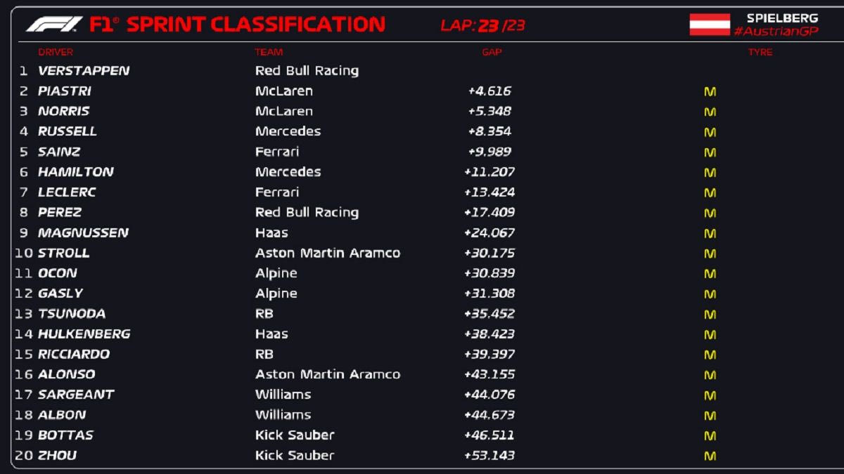 Ο Μαξ Φερστάπεν με τη Red Bull RB20 κατέκτησε τη νίκη του τρίτου φετινού αγώνα Sprint της Formula 1, στο πλαίσιο του GP Αυστρίας, κερδίζοντας μια συναρπαστική μάχη με τις δύο McLaren MCL38. Ο Όσκαρ Πιάστρι εκμεταλλεύτηκε τη μάχη του Ολλανδού με τον Λάντο Νόρις για να περάσει στην 2η θέση. Πίσω από τον Νόρις την εξάδα έκλεισαν οι Τζορτζ Ράσελ, Κάρλος Σάινθ και Λιούις Χάμιλτον.