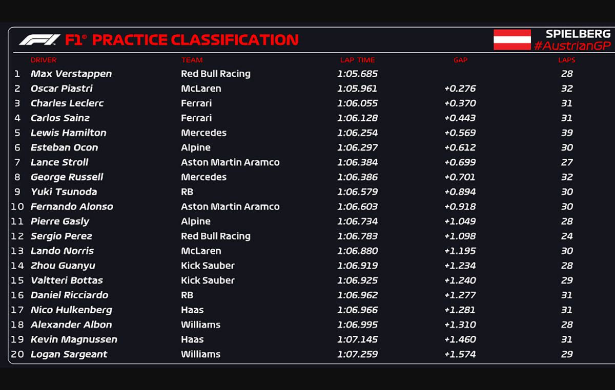 Η μονάδα ισχύος της Red Bull RB20 του Μαξ Φερστάπεν παρουσίασε μια δυσλειτουργία στην κεντρική ευθεία της πίστας του Σπίλμπεργκ περίπου στο μέσον των ελεύθερων δοκιμών του GP Αυστρίας, αλλά ο Ολλανδός επέστρεψε για να σημειώσει τον ταχύτερο γύρο. Στα τρία δέκατα η McLaren με τον Όσκαρ Πιάστρι, στα τέσσερα η Ferrari με τον Σαρλ Λεκλέρ.
