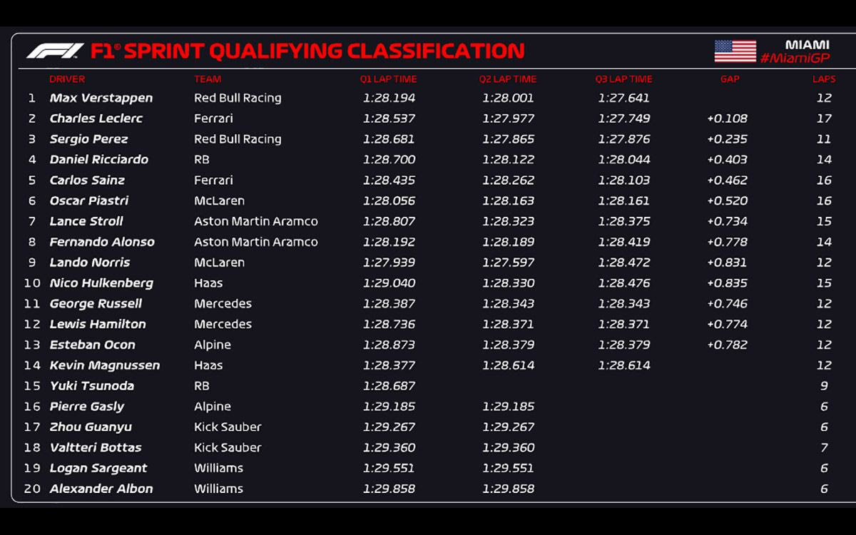 Παρότι είπε ότι ο γύρος του “ήταν απαίσιος” και αναρωτήθηκε “τι απέγιναν οι άλλοι;”, ο Μαξ Φερστάπεν βγήκε νικητής των δοκιμών κατάταξης (Sprint Qualifying) για τον αγώνα Sprint του Μαϊάμι – παρότι στις δύο πρώτες περιόδους δεν ήταν ταχύτερος. Δεύτερος, μόλις ένα δέκατο πίσω του, ο Σαρλ Λεκλέρ της Ferrari.