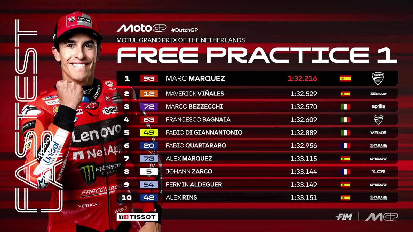 Επίσης, απευθείας στο Q2 πέρασαν οι δύο VR46 Ducati με τους Φάμπιο ντι Τζιαναντόνιο και Φράνκο Μορμπιντέλι, η Tech3 KTM με τον Μάβερικ Βινιάλες και η LCR Honda με τον Ζοάν Ζαρκό. Που σημαίνει ότι είχαν 8 διαφορετικές ομάδες στην πρώτη δεκάδα, προμηνύοντας ένα πολύ ενδιαφέρον διήμερο.