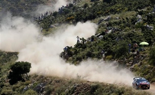 French World Champion Sebastien Loeb and his co-driver Daniel Elena drive with their Citroen DS3 during the Klenia-Mycenea stage of the WRC Acropolis Rally of Greece, near Korinth, Greece, Saturday, June 18, 2011. (AP Photo/Petros Giannakouris)