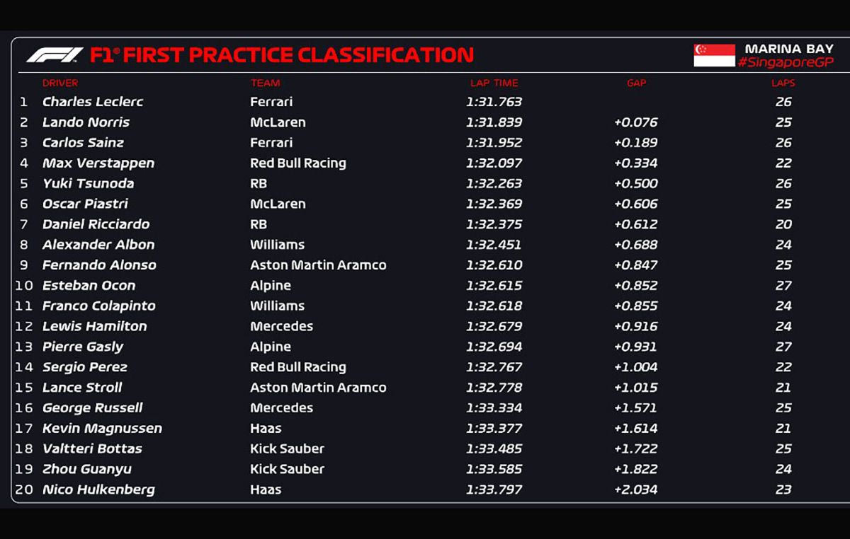 Η πρώτη περίοδος ελεύθερων δοκιμών του GP Σιγκαπούρης επιβεβαίωσε τα προγνωστικά μιας ακόμα μάχης -αυτό το τριήμερο- μεταξύ των Ferrari και McLaren, καθώς οι Σαρλ Λεκλέρ και Λάντο Νόρις χωρίστηκαν από λιγότερο από 1 δέκατο με τη μαλακή γόμα στην κορυφή των χρόνων.