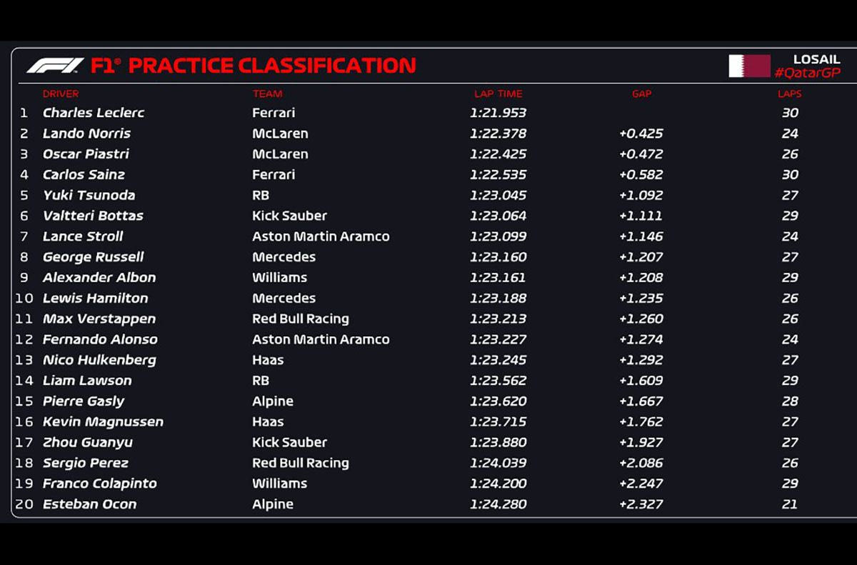 Το 23ο και προτελευταίο αγωνιστικό τριήμερο της μεγαλύτερης σεζόν της ιστορίας της Formula 1 ξεκίνησε στο Λοσάιλ του Κατάρ με τη μοναδική περίοδο ελεύθερων δοκιμών, στις οποίες ο Σαρλ Λεκλέρ με τη Ferrari SF-24 ήταν με διαφορά ταχύτερος των Λάντο Νόρις και Όσκαρ Πιάστρι με τις δύο McLaren MCL38.