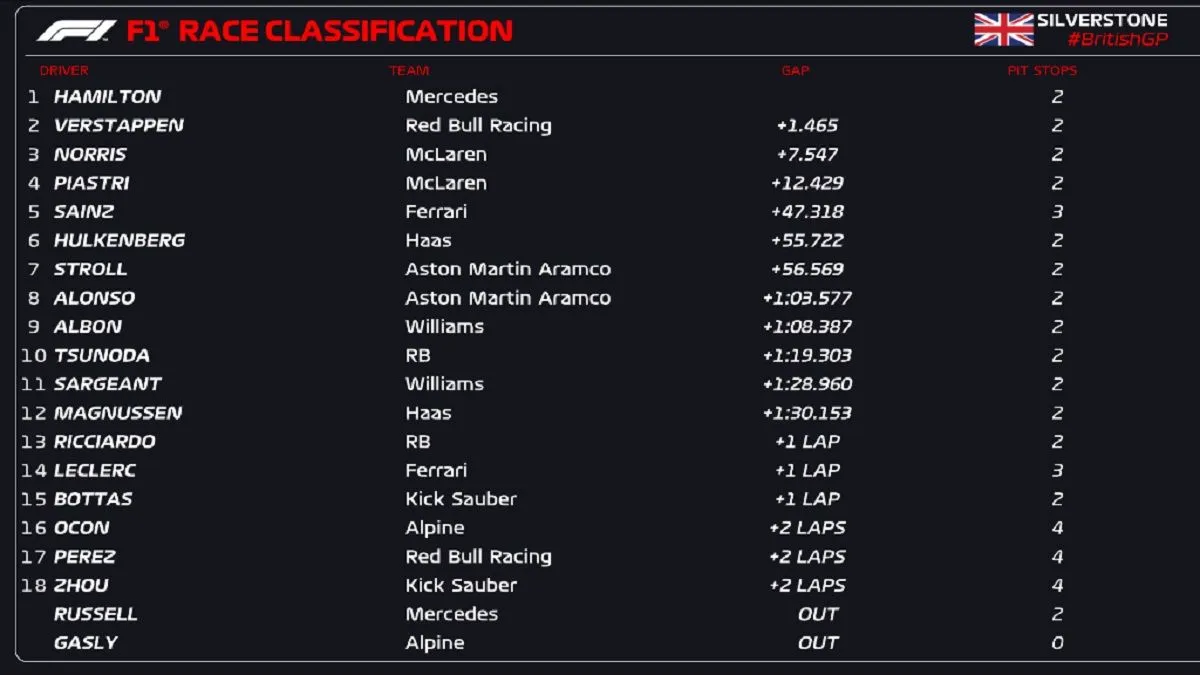 Τον ακολούθησε ο Φερστάπεν, που μέχρι το δεύτερο πιτ-στοπ δεν πίστευε ότι θα έφευγε από το Σίλβερστοουν με ένα τόσο καλό αποτέλεσμα, και τρίτος ο Λάντο Νόρις – που αναμφίβολα στερήθηκε περισσότερων ευκαιριών για τη νίκη από τις στρατηγικές επιλογές της McLaren.