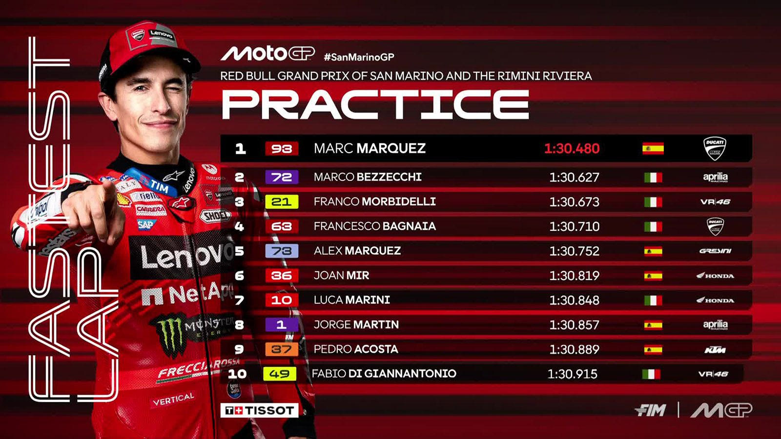 Ο πρωτοπόρος της βαθμολογίας του MotoGP, Μαρκ Μάρκεζ, επέστρεψε με την εργοστασιακή του Ducati στην κορυφή γράφοντας τον πρώτο χρόνο στα Χρονομετρημένα Δοκιμαστικά του GP του Αγ. Μαρίνου & Ρίμινι, ενώ ο ομόλογός του Πέκο Μπανάια προκρίθηκε απευθείας στο Q2 με τον 4ο χρόνο – βρίσκοντας λύσεις για τα προβλήματα που αντιμετώπιζε τον τελευταίο καιρό.