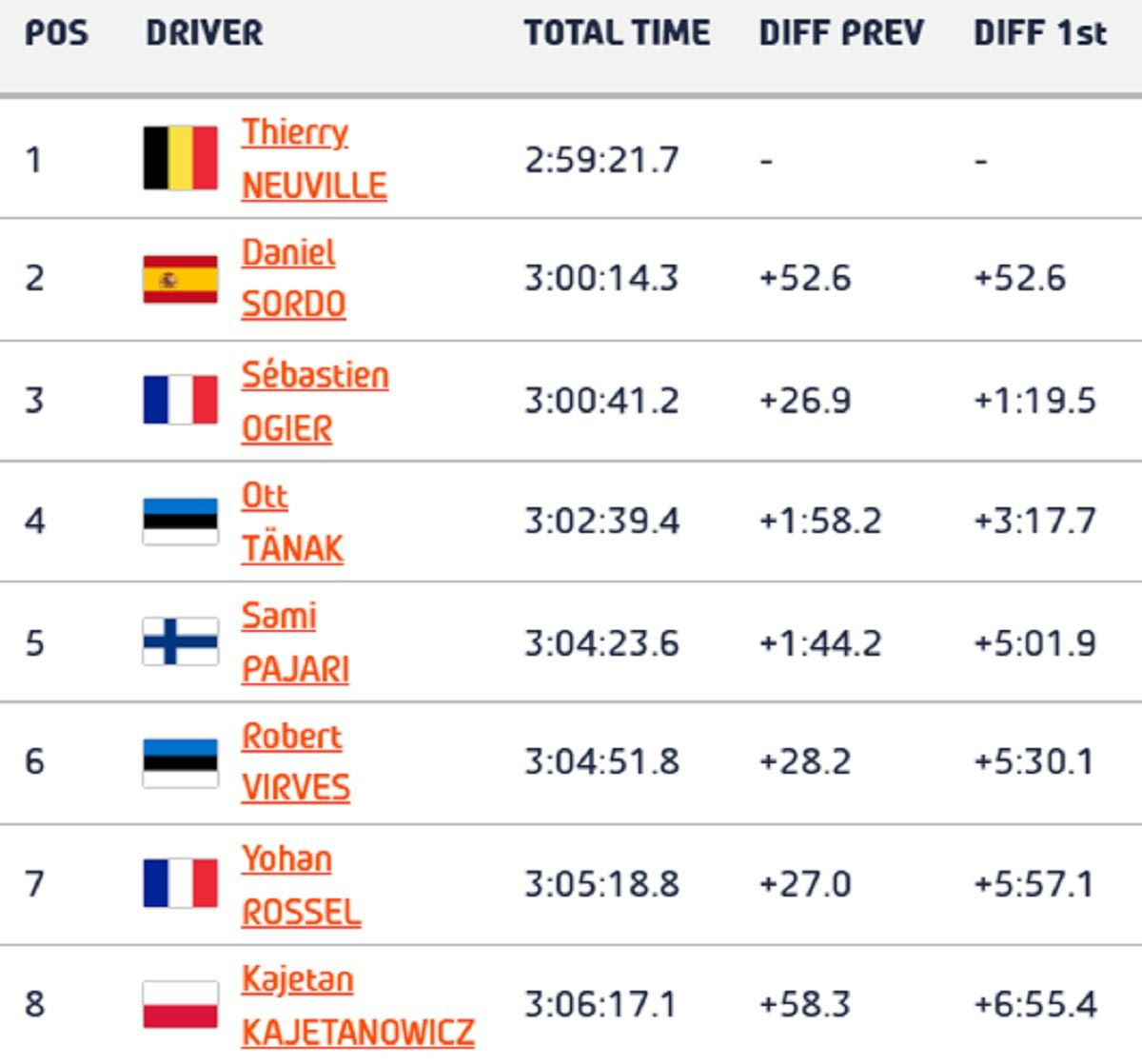 Στην κορυφή, ο Τιερί Νεβίλ -λέγοντας πως “ήταν απίστευτη μέρα μέχρι τώρα, ακολουθούμε το σχέδιό μας, να φέρουμε το αυτοκίνητο στον τερματισμό”- δεν αντιμετώπισε κανένα πρόβλημα αυτό το απόγευμα και αύξησε το προβάδισμά του στα 52,6’’ στην κορυφή, χάρη και στην ανάγκη του Σόρδο να διαφυλάξει το δικό του Hyundai μετά τη ζημιά που υπέστη στο πρώτο πέρασμα από τους Αγ. Θεοδώρους, το μεσημέρι, λόγω του αργού κλαταρίσματός του.