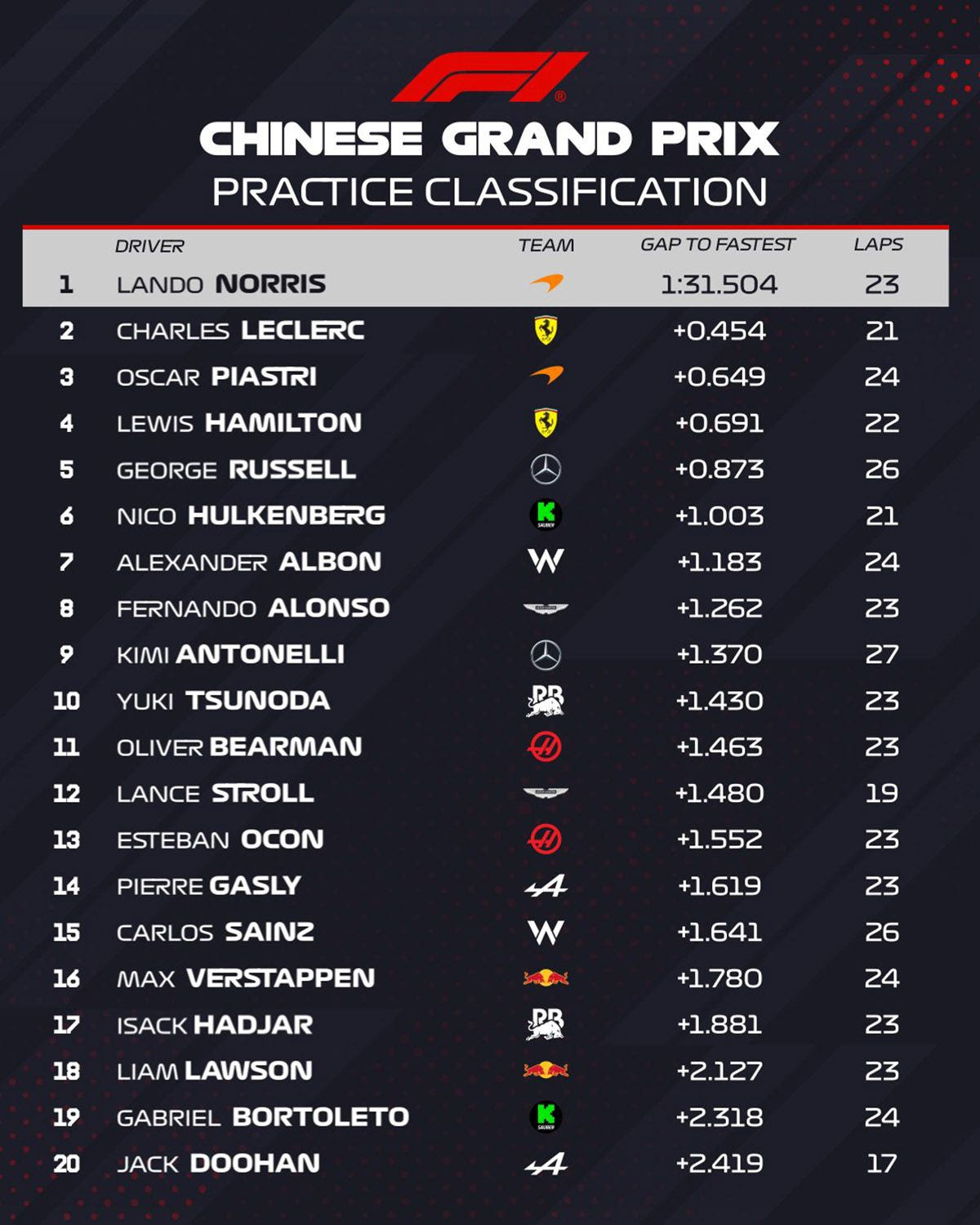 Σε αρκετά θερμές συνθήκες, αλλά με πολύ ισχυρό άνεμο, το 2ο φετινό αγωνιστικό τριήμερο της Formula 1 ξεκίνησε στην πίστα της Σαγκάης με τις ομάδες να έχουν μόνο μία ώρα ελεύθερων δοκιμών για να ρυθμίσουν τα μονοθέσιά τους (ειδικά στη νέα άσφαλτο της πίστας) – δεδομένου ότι στην Κίνα θα διεξαχθεί ο πρώτος από τους 6 φετινούς αγώνες Sprint.
