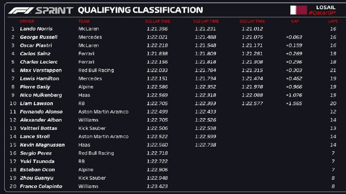 Ο Λάντο Νόρις επιβεβαίωσε τα προγνωστικά που ήθελαν τη McLaren να έχει το πάνω χέρι στο Κατάρ, κερδίζοντας στο αποψινό Sprint Qualifying την πολ ποζίσιον για τον αυριανό αγώνα Sprint στο Κατάρ, με διαφορά 63 χιλιοστών από τον Τζορτζ Ράσελ της Mercedes. Ο Όσκαρ Πιάστρι της McLaren στην 3η θέση, εμπρός από τις δύο Ferrari των Κάρλος Σάινθ και Σαρλ Λεκλέρ.