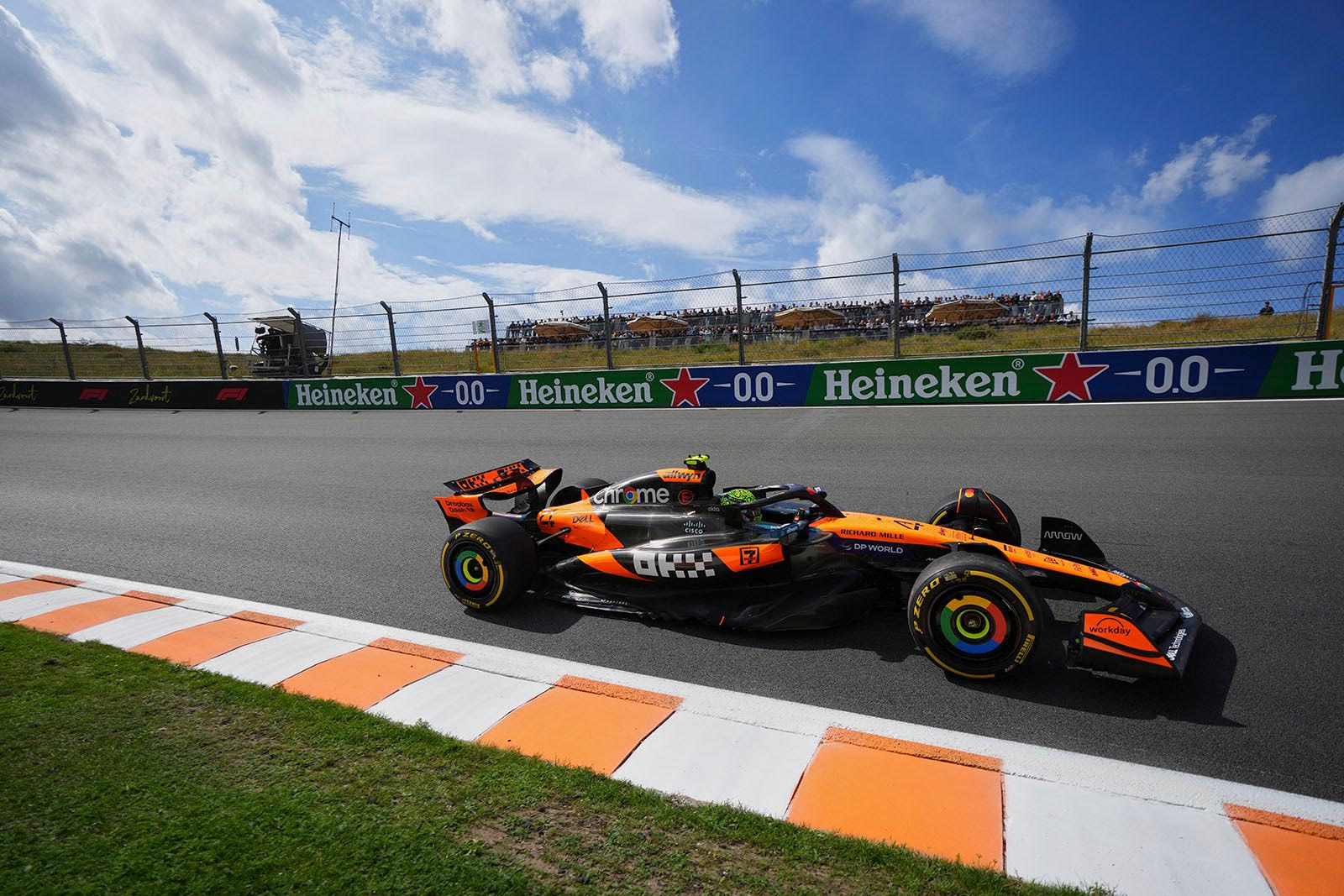 Σε μία ακόμα επεισοδιακή περίοδο ελεύθερων δοκιμών του GP Ολλανδίας, τη δεύτερη, ο Λάντο Νόρις της McLaren παράμεινε ταχύτερος, αλλά ο Φερνάντο Αλόνσο της Aston Martin και ο Όσκαρ Πιάστρι τον πλησίασαν κάτω από ένα δέκατο του δευτερολέπτου. Ισχυρό ατύχημα του Λανς Στρολ με την έτερη Aston, για την πρώτη από τις δύο κόκκινες σημαίες (συν ένα VSC) της περιόδου.