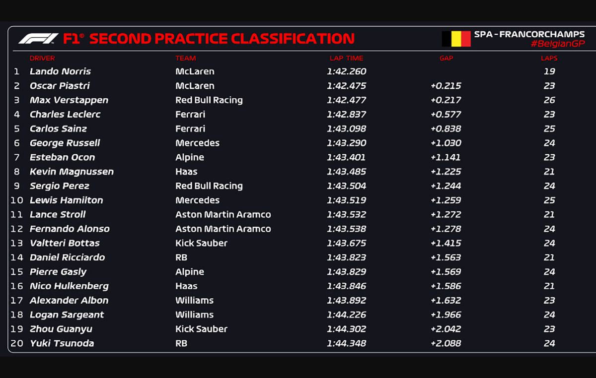 Ο Λάντο Νόρις ηγήθηκε του 1-2 της McLaren στη δεύτερη περίοδο ελεύθερων δοκιμών του GP Βελγίου, καθώς ήταν δύο δέκατα του δευτερολέπτου ταχύτερος από τον Όσκαρ Πιάστρι - ενώ ο Μαξ Φερστάπεν με τη Red Bull RB20 ακολούθησε στα 2 χιλιοστά τον Αυστραλό.