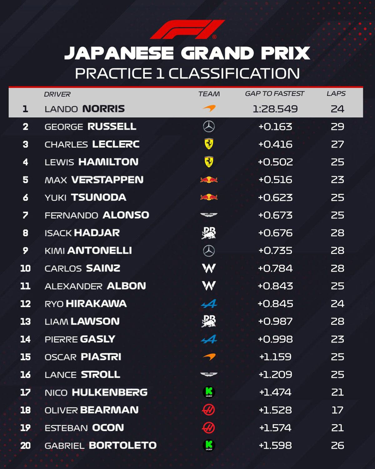 Ο Λάντο Νόρις κράτησε τη McLaren στην κορυφή στην πρώτη περίοδο ελεύθερων δοκιμών του GP Ιαπωνίας, σημειώνοντας τον ταχύτερο χρόνο με διαφορά 0,16’’ από τον Τζορτζ Ράσελ της Mercedes. Στις θέσεις 3-4 οι Λεκλέρ-Χάμιλτον με τις δύο Ferrari, εμπρός από τις δύο Red Bull των Φερστάπεν-Τσουνόντα.