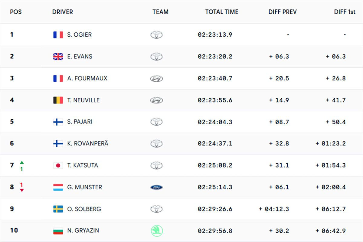 Ο Οζιέ ξεκίνησε την ημέρα μόλις 2,3’’ πίσω από την κορυφή στην τρίτη θέση, αλλά αρχικά έπεσε τέταρτος, καθώς προτίμησε συντηρητική προσέγγιση με το Toyota GR Yaris Rally1 στις βρεγμένες πρωινές Ειδικές.