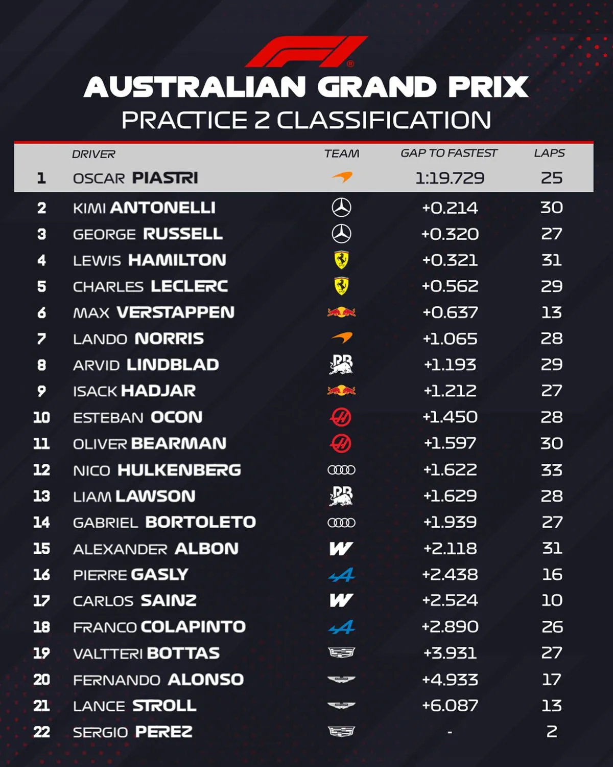Η McLaren έδωσε μια πρώτη ένδειξη της αληθινής ταχύτητας της νέας MCL40 στη 2η περίοδο ελεύθερων δοκιμών του GP Αυστραλίας, καθώς με τη μαλακή γόμα στις προσομοιώσεις κατατακτήριων ο Όσκαρ Πιάστρι ήταν δύο δέκατα ταχύτερος του Κίμι Αντονέλι της Mercedes και τρία δέκατα από τη Ferrari του Λιούις Χάμιλτον.