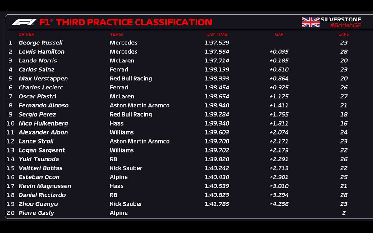 Μια τριάδα Βρετανών οδηγών, με επικεφαλής τον Τζορτζ Ράσελ της Mercedes εμπρός από τον ομόλογό του Λιούις Χάμιλτον και τον Λάντο Νόρις της McLaren, σημείωσαν τους τρεις πρώτους χρόνους με την ενδιάμεση βρόχινη γόμα στην 3η περίοδο ελεύθερων δοκιμών του GP Βρετανίας.