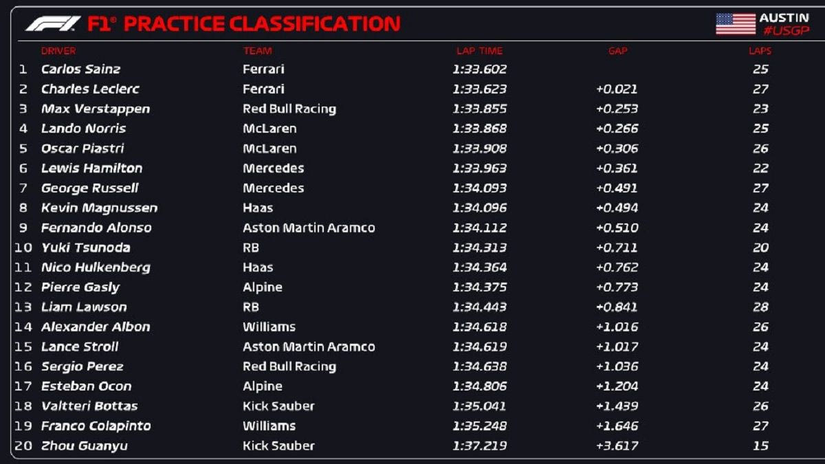 Ο Κάρλος Σάινθ και ο Σαρλ Λεκλέρ τοποθέτησαν τις δύο Ferrari SF-24 στην κορυφή της μοναδικής περιόδου ελεύθερων δοκιμών του GP των ΗΠΑ στο Όστιν, με διαφορά δυόμισι δεκάτων του δευτερολέπτου από τους διεκδικητές του τίτλου Μαξ Φερστάπεν (Red Bull) και Λάντο Νόρις (McLaren).