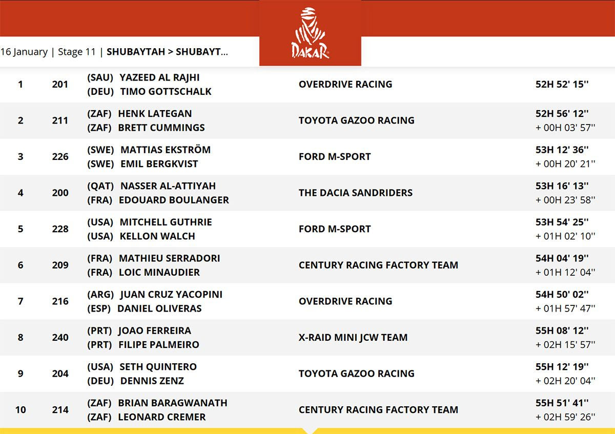 Στο τέλος, ο Σαουδάραβας Γιαζίντ Αλ Ραζί, πολύπειρος πλέον στο Ντακάρ με παρουσία μίας ολόκληρης δεκαετίας, με την πλοήγηση του Γερμανού συνοδηγού του Τίμο Γκότσαλκ, κέρδισε τα πέντε εργοστασιακά Toyota Hilux T1+ με το δικό του αντίστοιχο Hilux της Overdrive – γράφοντας ιστορία με τη νίκη του ως ιδιώτης.