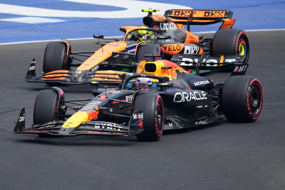 Red Bull driver Max Verstappen of the Netherlands, front, and McLaren driver Lando Norris of Britain steer their cars during the third free practice ahead of the Formula One Mexico Grand Prix auto race at the Hermanos Rodriguez racetrack in Mexico City, Saturday, Oct. 26, 2024. AP Photo/Eduardo Verdugo