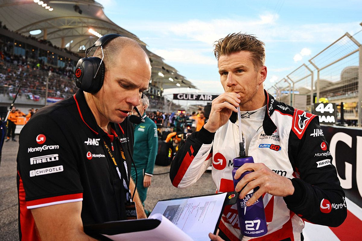BAHRAIN INTERNATIONAL CIRCUIT, BAHRAIN - MARCH 02: Nico Hulkenberg, Haas F1 Team, with his engineer on the grid during the Bahrain GP at Bahrain International Circuit on Saturday March 02, 2024 in Sakhir, Bahrain. HAAS F1 MEDIA