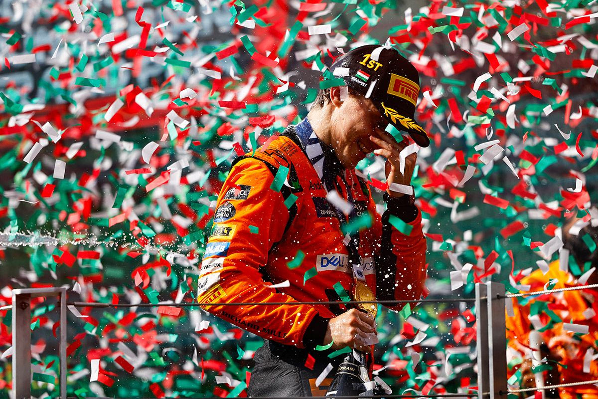 Oscar Piastri, McLaren F1 Team, 1st position, sprays the victory Champagne on the podium as confetti falls McLaren Media Centre