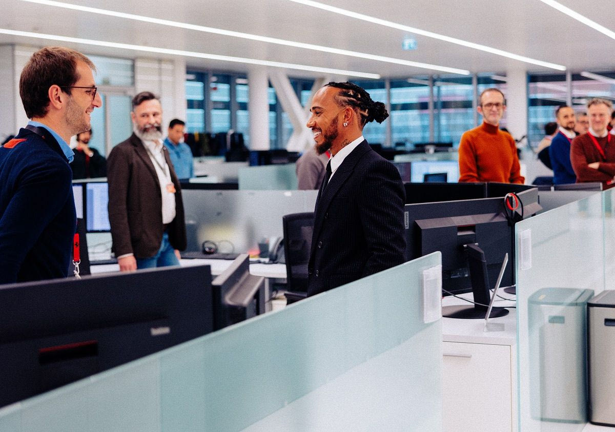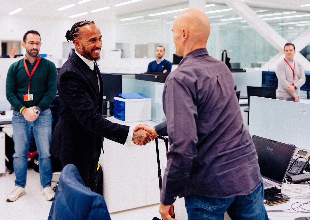 Η ημέρα του Χάμιλτον ξεκίνησε με την επίσκεψή του στους διάφορους τομείς του εργοστασίου του Μαρανέλο, όπου γνωρίστηκε με κάθε εργαζόμενο της ομάδας και συζήτησε με τους μηχανικούς με τους οποίους θα συνεργάζεται από φέτος στο γκαράζ της Scuderia στα GP της F1.