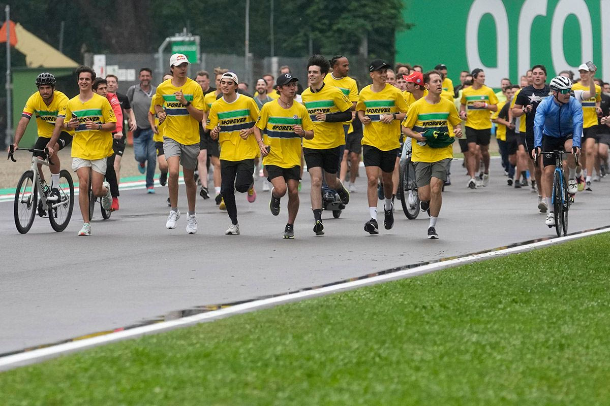 Αρχικά οι συμμετέχοντες φωτογραφήθηκαν στην εκκίνηση μπροστά στις σημαίες και τα κράνη των δύο αξέχαστων πιλότων, και εν συνεχεία κάλυψαν την πίστα κάνοντας τζόγκινγκ ή ποδήλατο – και δεν πτοήθηκαν ακόμα κι όταν άνοιξαν οι ουρανοί πάνω από την Εμίλια Ρομάνια.