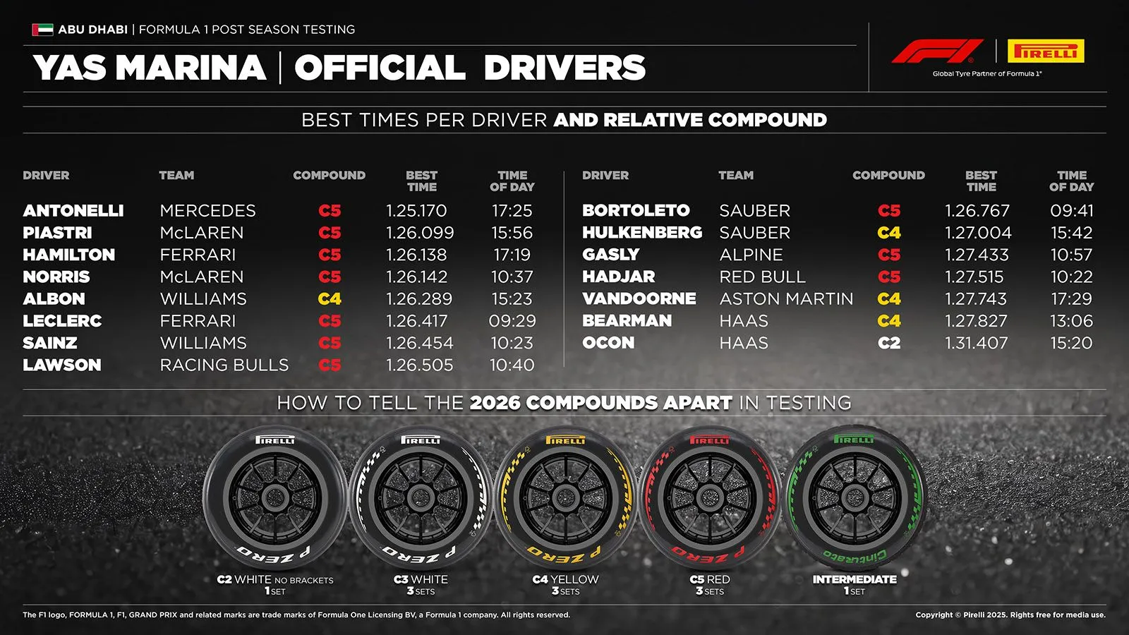 Δοκιμές F1 Άμπου Ντάμπι – Οι χρόνοι των πρωτοτύπων μονοθεσίων 2025/26 (με τα αντίστοιχα ελαστικά)