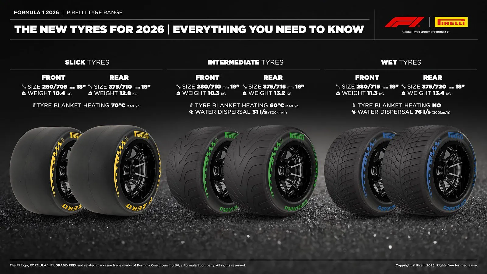 Η Pirelli παρουσίασε, παράλληλα, τα νέα γραφικά στα τοιχώματα των ελαστικών, αλλά η μεγάλη διαφορά είναι ότι οι νέες γόμες είναι αισθητά στενότερες – με στόχο τη μείωση της αντίστασης στον αέρα και του βάρους.