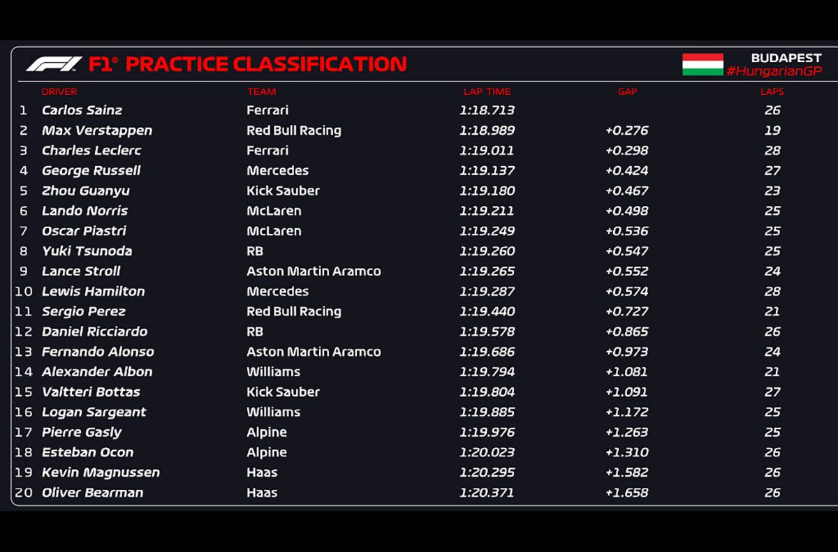 Στην πίστα της Βουδαπέστης, που ταιριάζει ιδιαίτερα στις προδιαγραφές της Ferrari SF-24, η Scuderia ξεκίνησε το 13ο φετινό αγωνιστικό τριήμερο της Formula 1 με τον Κάρλος Σάινθ ταχύτερο κατά δυόμισι δέκατα από την εκτενώς ανασχεδιασμένη Red Bull RB20 του Μαξ Φερστάπεν.