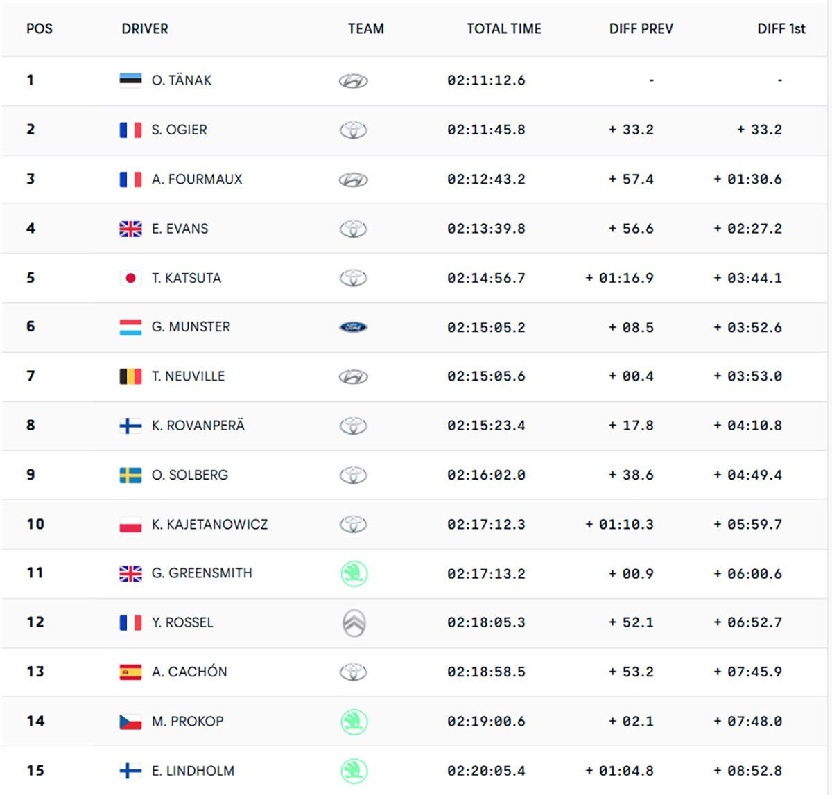 Ο Ιάπωνας κατάφερε να αποσπαστεί από τους Τιερί Νεβίλ και Κάλε Ροβάνπερα, τους δύο δις νικητές του Ακρόπολις, που κλείνουν την οκτάδα. Ο Βέλγος της Hyundai είχε άλλο ένα κλατάρισμα (το τρίτο του στον αγώνα) στην Παύλιανη, ενώ ο Ροβάνπερα δεν είχε το ρυθμό που ήθελε – ειδικά στο Οινοχώρι. “Δεν έχω πολλά να πω για αυτό, απλά δεν μας πάει τόσο καλά προς στιγμήν”, είπε ο δις πρωταθλητής.