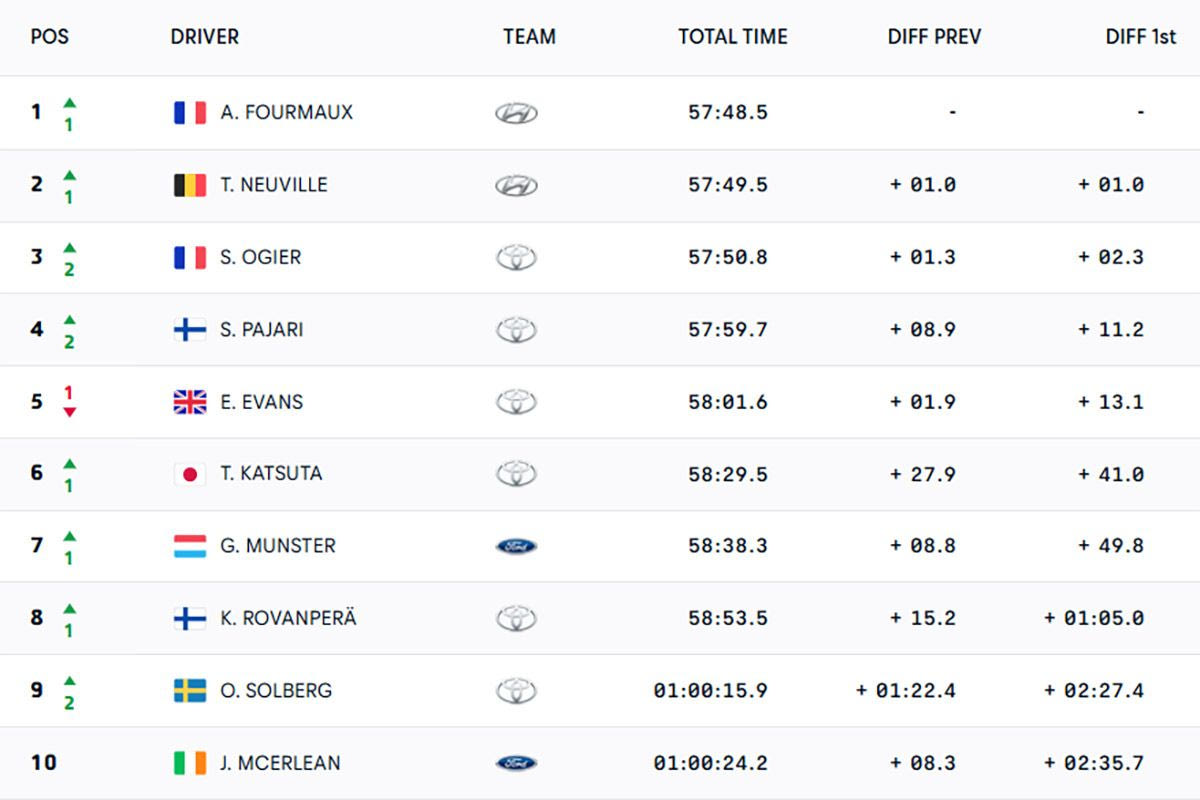 Η αποχώρηση του Εσθονού έφερε στην τριάδα και στο κάδρο της νίκης και τον Σεμπαστιάν Οζιέ, ο οποίος αρχικά έμεινε πίσω το πρωί λόγω λανθασμένης κατεύθυνσης στις ρυθμίσεις του Toyota GR Yaris Rally1. Όμως ο Γάλλος αντέδρασε εντυπωσιακά το απόγευμα κερδίζοντας την 6η ΕΔ και μειώνοντας τη διαφορά του στα 2,3’’ από την κορυφή.