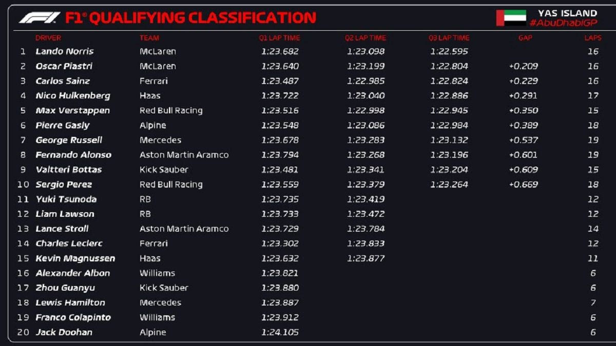 Η McLaren επιβεβαίωσε τα προγνωστικά για την κυριαρχία της στις δοκιμές κατάταξης του GP του Άμπου Ντάμπι, 24ου και τελευταίου φετινού αγώνα της Formula 1, καθώς με δύο άρτιους γύρους των Λάντο Νόρις και Όσκαρ Πιάστρι στο τέλος του Q3 κλείδωσε την πρώτη σειρά της εκκίνησης, και ουσιαστικά και τον φετινό τίτλο των κατασκευαστών.