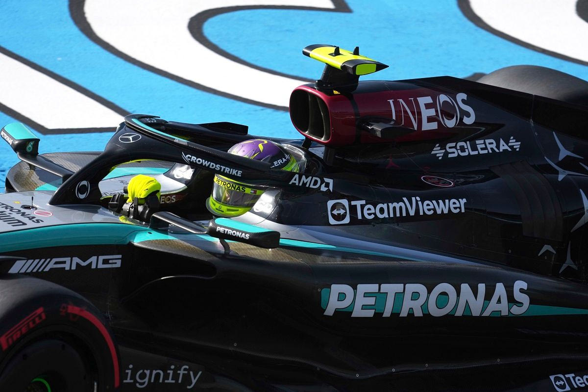 Στη διάρκεια της δεύτερης περιόδου (Q2) των δοκιμών κατάταξης του GP Ολλανδίας ο Λιούις κινούνταν αργά στη δεξιά στροφή 9, αλλά έμεινε στην εξωτερική πλευρά της στροφής για να μην εμποδίσει τον Πέρεζ που ερχόταν με την Red Bull RB20 σε έναν γρήγορο γύρο του.