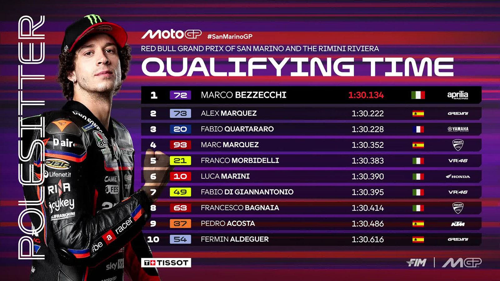 Όμως ο Μπετζέκι, στη σέλα της εργοστασιακής Aprilia, εκμεταλλεύτηκε το slipstream του ομόλογού του Χόρχε Μαρτίν και σταμάτησε το χρονόμετρο στο 1:30.134 στην τελευταία του προσπάθεια. Ο Άλεξ δεν κατάφερε να βελτιώσει περαιτέρω, κι έτσι ο Ιταλός κράτησε την πολ ποζίσιον στην έδρα του με διαφορά μόλις 0.088 δευτερολέπτων. Πρόκειται για τη δεύτερη πολ ποζίσιον του φέτος, μετά το GP Βρετανίας τον Μάιο.