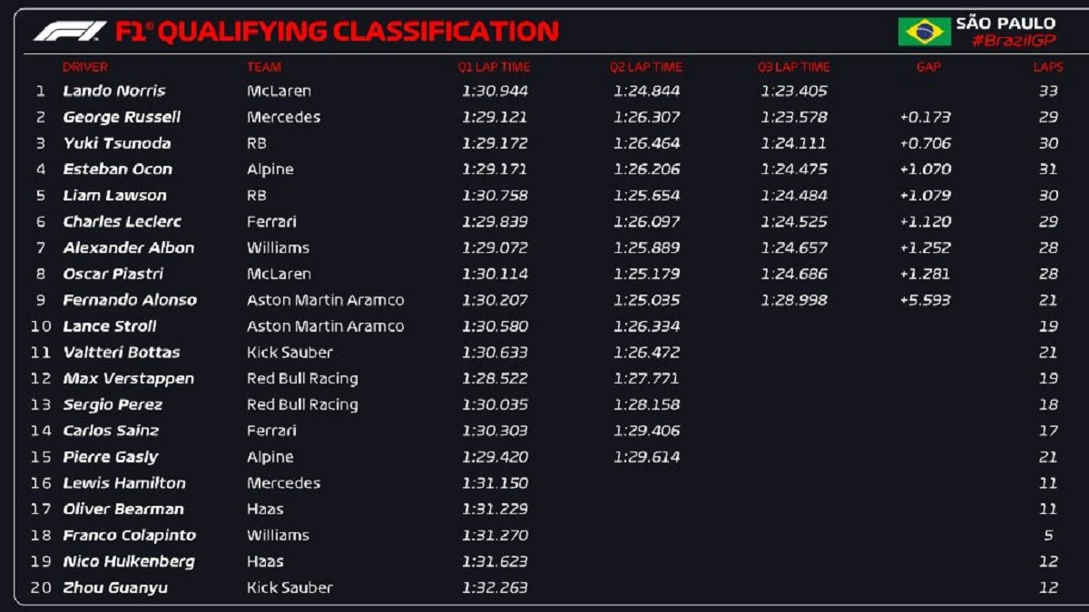 Ο Λάντο Νόρις της McLaren κατέκτησε την πολ ποζίσιον του GP Βραζιλίας, που κατέστη δυνατό να διεξαχθούν παρά τις βροχές συνθήκες, εμπρός από τον Τζορτζ Ράσελ της Mecedes, ενώ ο Μαξ Φερστάπεν περιορίστηκε στην 12η θέση – που θα μετατραπεί σε 17η για την εκκίνηση του σημερινού (3/11, 17:30) αγώνα του Ιντερλάγκος λόγω της αλλαγής του κινητήρα του Ολλανδού.