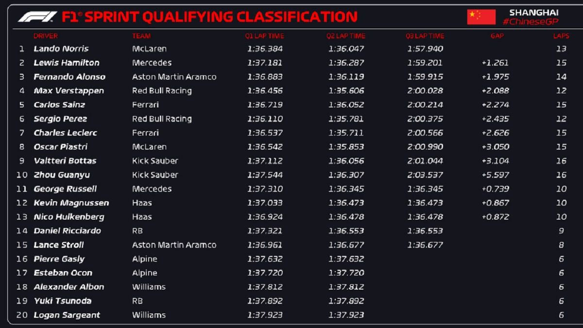 Σε ένα εκπληκτικό φινάλε του Sprint Qualifying του GP Κίνας, υπό βροχή ο Λάντο Νόρις κατάφερε να κατακτήσει την πολ ποζίσιον του αυριανού αγώνα Sprint της Σαγκάης, εμπρός από τον Λιούις Χάμιλτον και τον Φερνάντο Αλόνσο. Στην 4η θέση ο Μαξ Φερστάπεν.