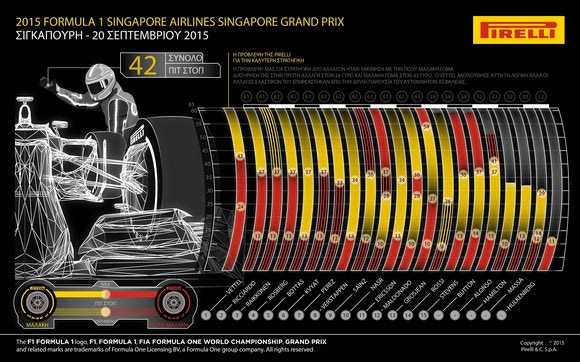 Ο αγωνιστικός διευθυντής της Pirelli, Paul Hembery σχολίασε: « Η τακτική αλλά και η διαχείριση των ελαστικών έπαιξαν πολύ σημαντικό ρόλο κατά τη διάρκεια του νυχτερινού αγώνα. Όπως πάντα στη Σιγκαπούρη οι συνθήκες ήταν ακραίες, είχε ζέστη, υγρασία και ο αγώνας διήρκησε πολύ. Όλα αυτά δεν επηρέασαν το Sebastian Vettel και τη Ferrari που αξιοποίησαν άριστα τα ελαστικά και τη στρατηγική τους γνωρίζοντας σε ποια σημεία να πιέσουν και που να προφυλάξουν μέρος της δυναμικής τους. Ήταν ένας τέλειος αγώνας από την πλευρά του. Προφανώς η στρατηγική των ομάδων επηρεάστηκε από τις δυο εμφανίσεις του αυτοκινήτου ασφαλείας που άλλαξε τα μέρη του αγώνα. Αυτό είχε ως αποτέλεσμα περισσότεροι οδηγοί να κάνουν δυο αντί για τρεις αλλαγές ελαστικών. Παραταύτα υπήρχαν διαφορετικές σκέψεις για το πότε θα χρησιμοποιηθεί η κάθε γόμα. Με τέτοια μεγάλη διάρκεια αγώνα ήταν σημαντικό να προστατεύεις τα ελαστικά όσο το δυνατό περισσότερο και αποδείχτηκε καθοριστικό στο τελευταίο μέρος».