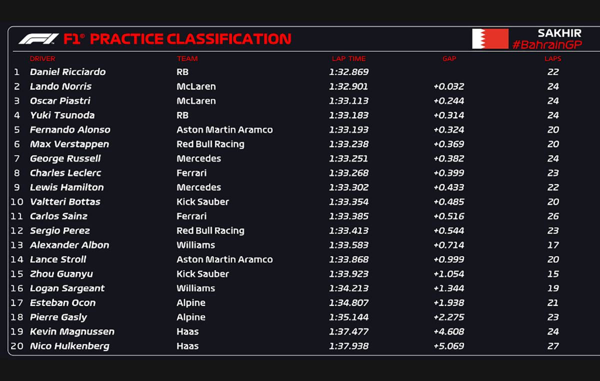 Ρίχνοντας “λάδι στη φωτιά” όσων δυσανασχετούν με την υιοθέτηση της ανάρτησης της Red Bull από την θυγατρική της ομάδα RB (πρώην Alpha Tauri, νυν Visa Cash App RB), o Ντάνιελ Ρικιάρντο σημείωσε τον ταχύτερο χρόνο στην πρώτη περίοδο ελεύθερων δοκιμών του GP του Μπαχρέιν, εναρκτήριου της φετινής χρονιάς.