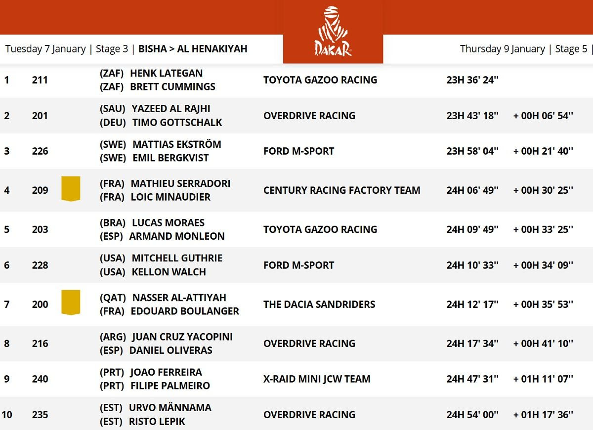 Ο Νοτιοαφρικανός Λάτεγκαν έγραψε μεν το δεύτερο χρόνο σήμερα, αλλά έχασε σχεδόν 5 λεπτά από τον Αλ Ραζί, που ήταν ταχύτερος της ημέρας στο ηφαιστειακό τερέν και έπειτα στις κοιλάδες της Αλ Ούλα – με αποτέλεσμα ο 43χρονος Σαουδάραβας της Overdrive να τον πλησιάσει στα 6’:54’’ στην κορυφή της γενικής κατάταξης.