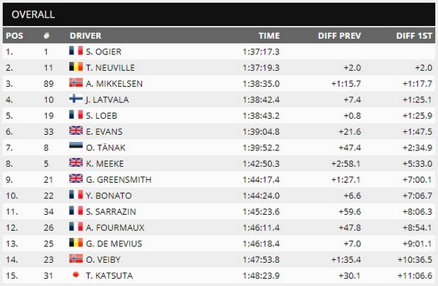 Ο Λάτβαλα, στο μεταξύ, καρπώθηκε της ανάλογης του Νεβίλ επιλογής ελαστικών: έτσι, ξεκίνησε το απόγευμα με τον πρώτο χρόνο μαζί με τον Οζιέ στον πάγο της 6ης Ειδικής, έχασε πολύ στην επόμενη Ειδική που ήθελε σλικς, αλλά ήταν και πάλι ταχύς στην τελευταία της ημέρας. «Επιλέξαμε ελαστικά χιονιού για αυτή την Ειδική για να καλύψουμε λίγο χαμένο χρόνο. Θα έχει πολύ ενδιαφέρον αύριο!», είπε ο Φινλανδός.