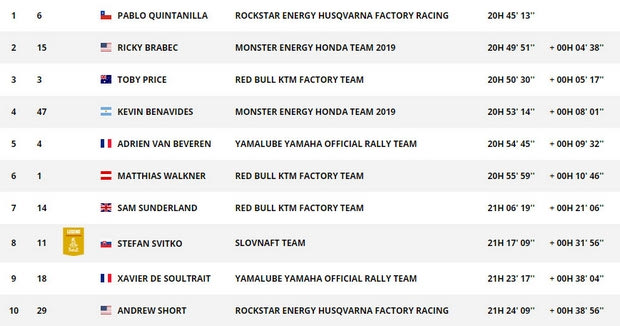 Στους δύο τροχούς, ο Χιλιανός Πάμπλο Κιντανίγια άφησε πίσω την ατυχή του 5 Ειδική, και κυριαρχώντας στο δρόμο προς το Σαν Χουάν ντε Μαρκονά κατάφερε να περάσει με την εργοστασιακή του Husqvarna τον Ρίκι Μπράμπεκ στην κορυφή της γενικής κατάταξης!