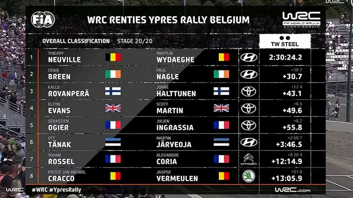 Ο οδηγός της Hyundai κέρδισε την πρώτη του φετινή νίκη, 19 μήνες μετά την τελευταία του στο WRC, ελέγχοντας ολοκληρωτικά το Ράλι Ypres του Βελγίου από τον ομόλογό του Κρεγκ Μπριν. Ο Κάλε Ροβάνπερα νικητής της μάχης των Toyota για το βάθρο.