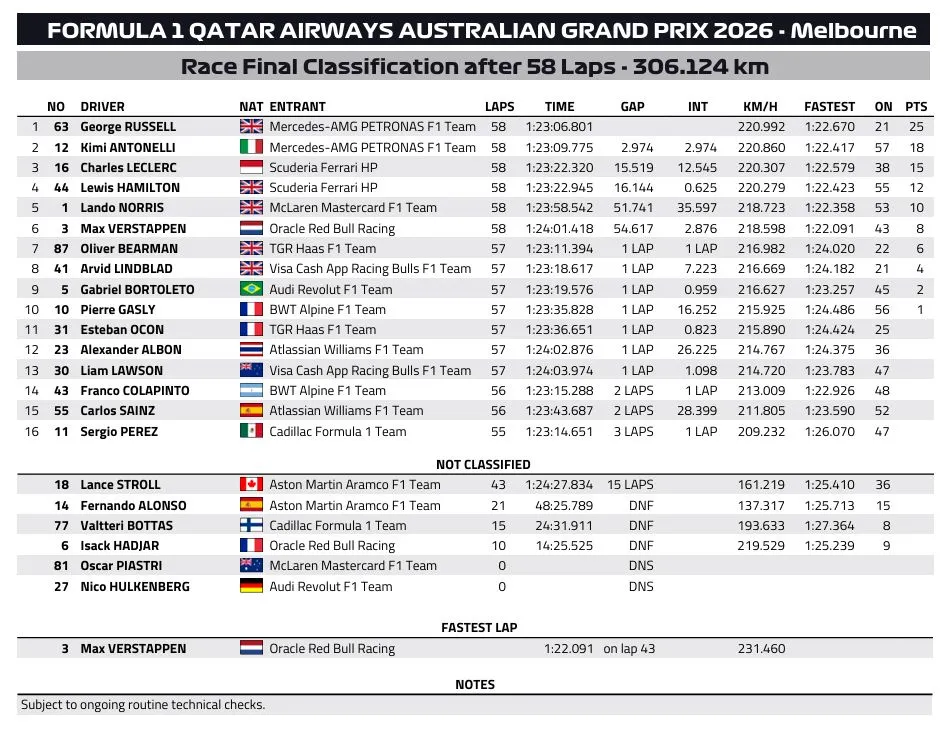Η τελική κατάταξη του 1ου Grand Prix στην Αυστραλία έχει ως εξής: